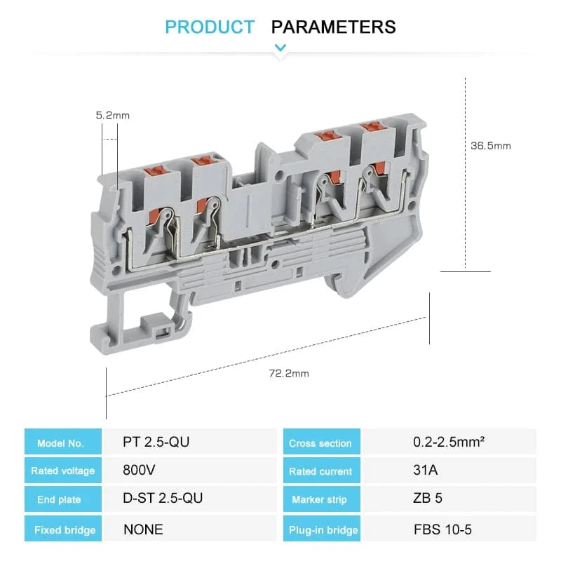 Related terms: push-in DIN rail terminal block 2.5 mm, IEC 60947-7-1 terminal, NS 35/7.5 terminal block, 800V 31A terminal, PT 2.5 QUATTRO push-in, 5.2 mm width terminal, FBS bridge ZB5 marker E-UK end stop.