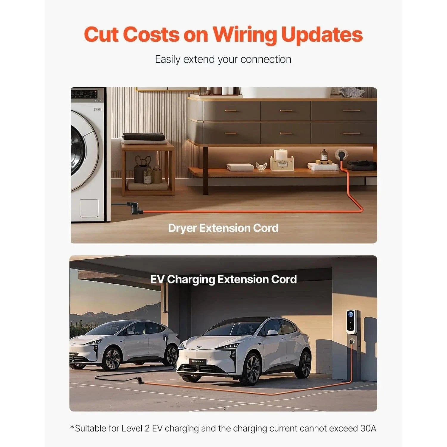 · EV Charger Extension Cord: This dryer cord can serve as an extension for your EV charger, suitable for Level 2 EV charging, such as for Tesla Model 3, Model S, Model X, and Model Y (it is recommended to adjust the charging current to 30A or below)