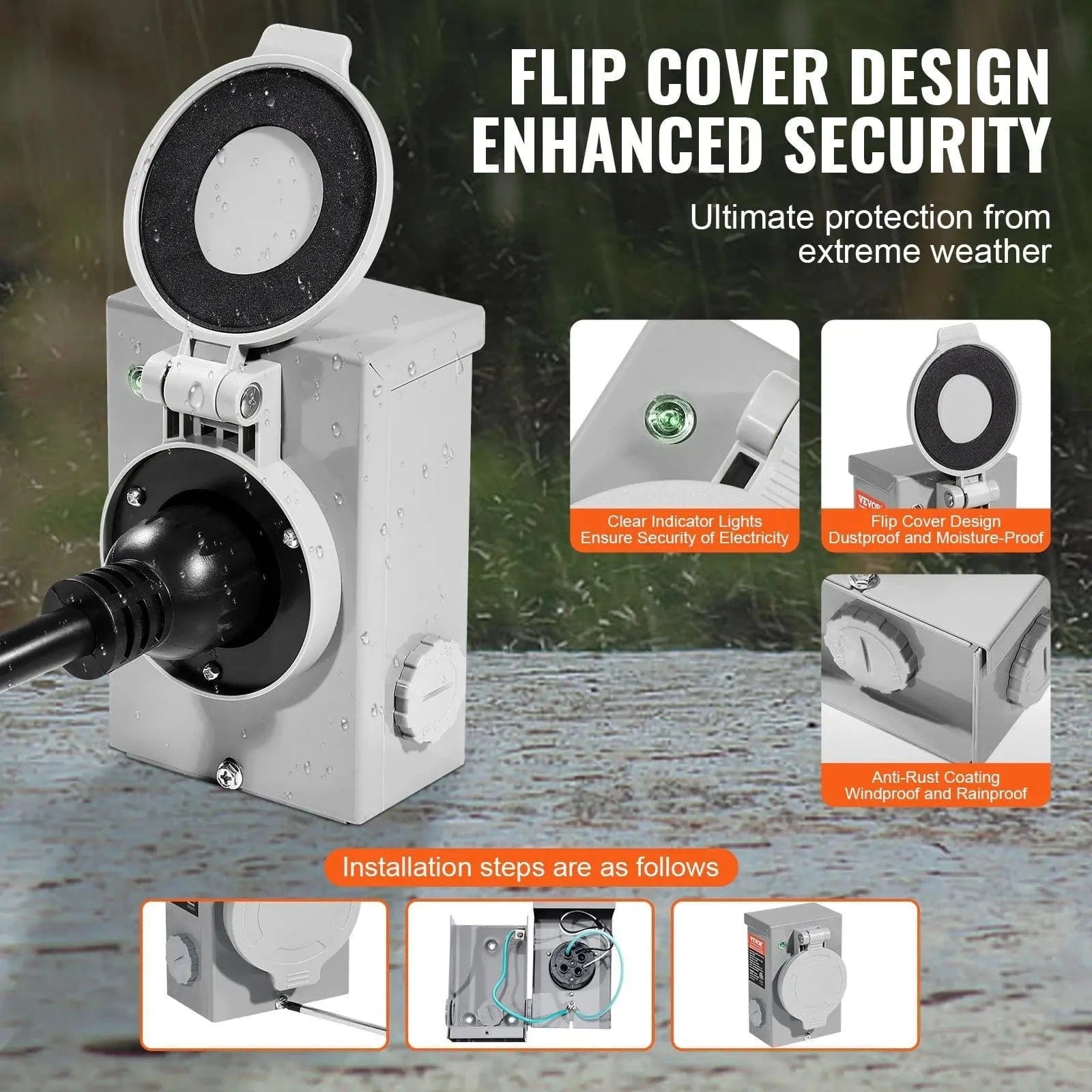 Our generator cord and power inlet box kit are designed to deliver stable and secure power output to your home or RV, even in outdoors, in power outage situations, or adverse weather. Whether facing rain, wind, or extreme temperatures, our kit keeps you powered up when you need it most.