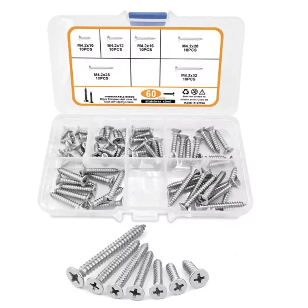 #8 Self-Drilling Wood Screw Set, 60pcs Cross Flat Head Steel Plate Screws with Self-Locking Nuts, Wood Thread Screw Kit