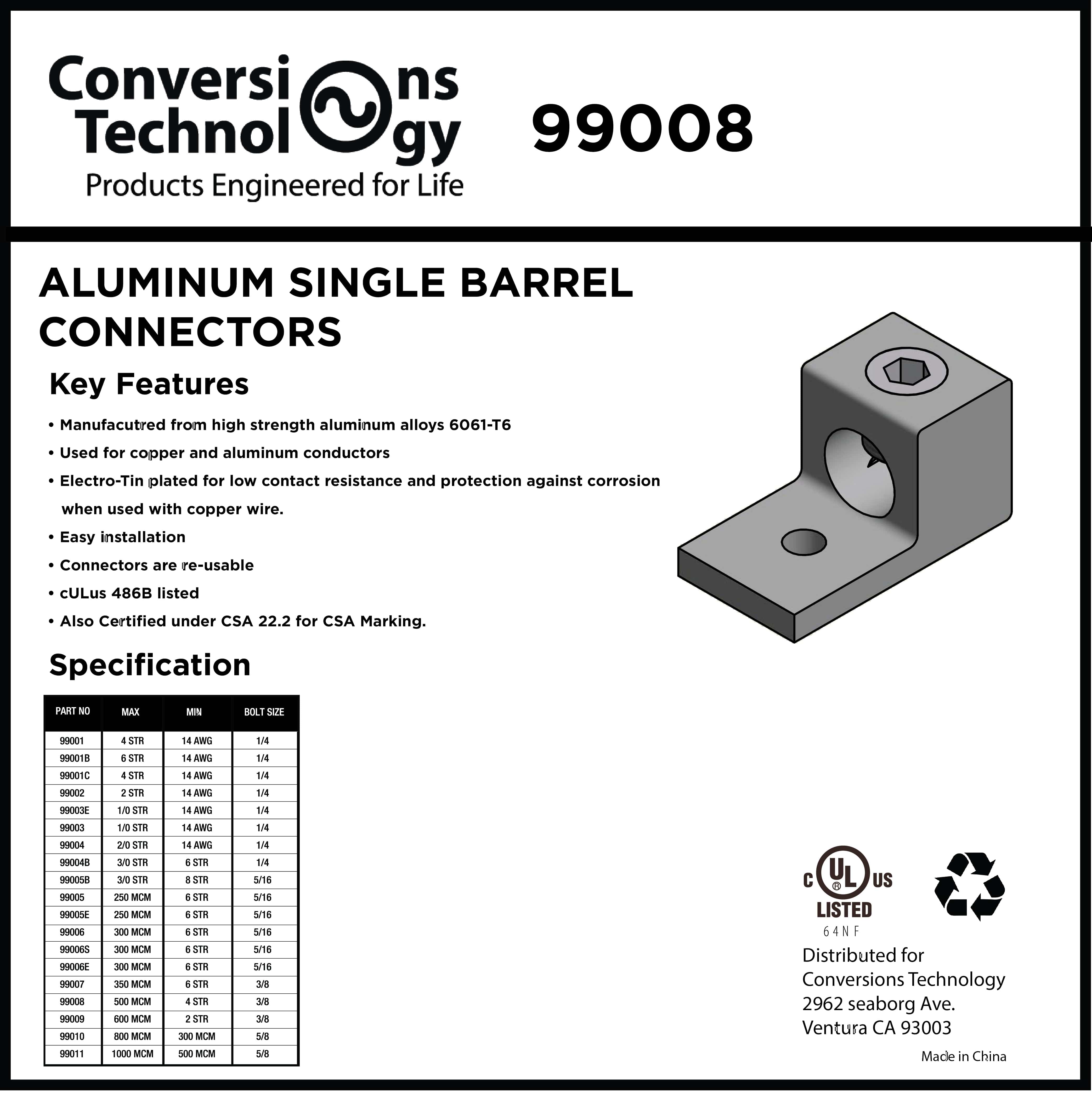 The 99008  is a versatile and robust electrical connector designed to facilitate secure and efficient wire terminations. With a durable aluminum construction, this lug is built to accommodate wire sizes ranging from 4 AWG to 500 MCM, providing flexibility for a wide range of electrical applications. The 99008 ensures reliable connections, meeting the demands of diverse industries where dependable electrical conductivity is essential. A trusted name in the electrical industry, the 99008 exemplifies quality and performance in every connection.