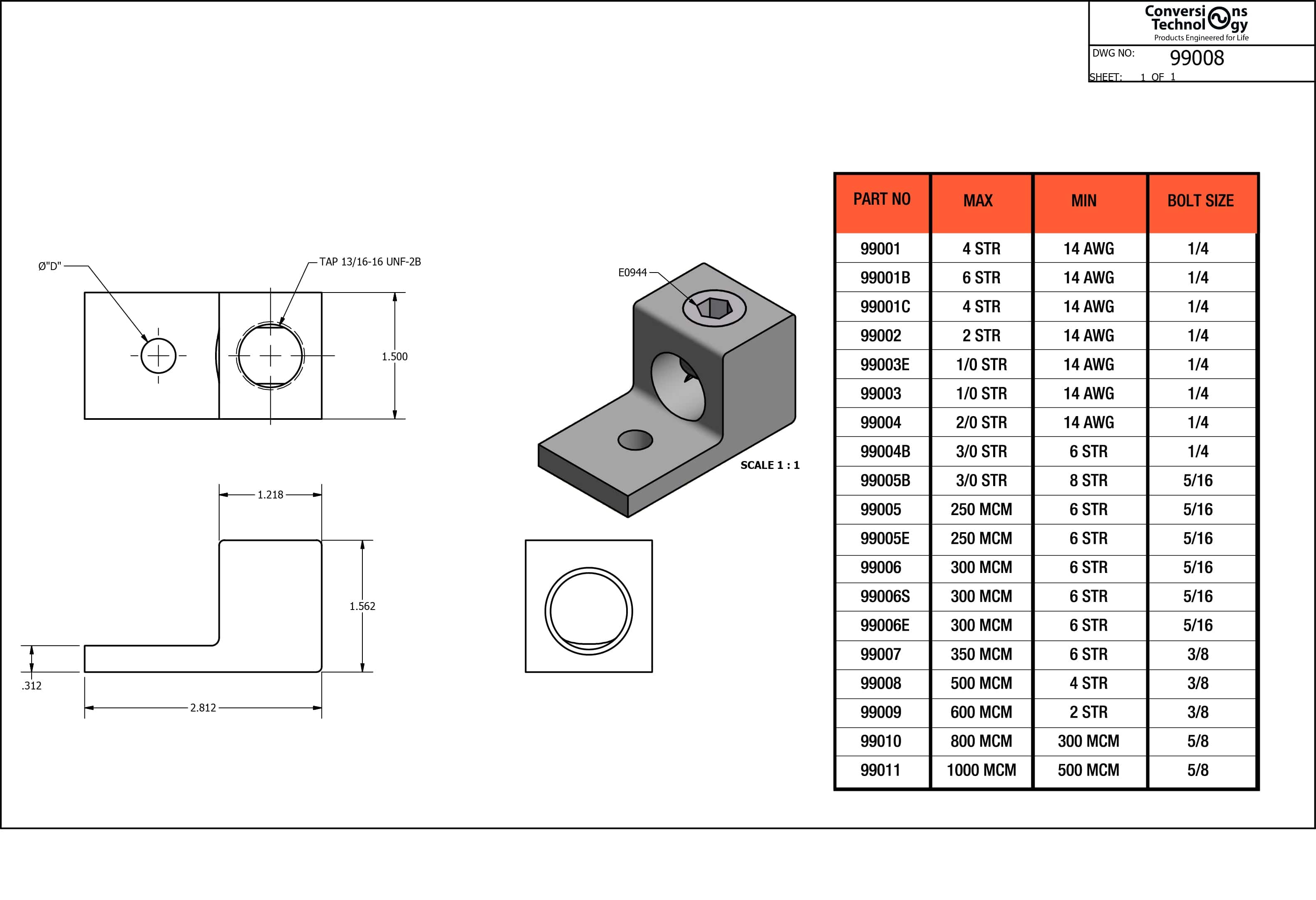 The 99008 is a durable aluminum lug designed for electrical connections, capable of accommodating wire sizes ranging from 4 AWG to 500 MCM. With a reliable construction and compatibility with a wide range of wire gauges, the 99008 lug ensures secure and efficient electrical terminations in various applications.