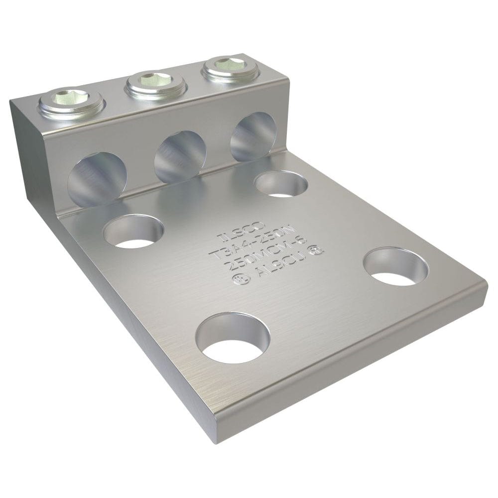 The 99032 3-Conductor Lug is a robust electrical connector designed for terminating three conductors securely. Featuring chamfered wire entry and constructed from high-strength 6061-T6 aluminum alloy, it ensures durability and ease of conductor insertion. This lug accommodates a broad range of conductor sizes, from 6 AWG to 250 kcmil, providing versatility for various wiring applications.