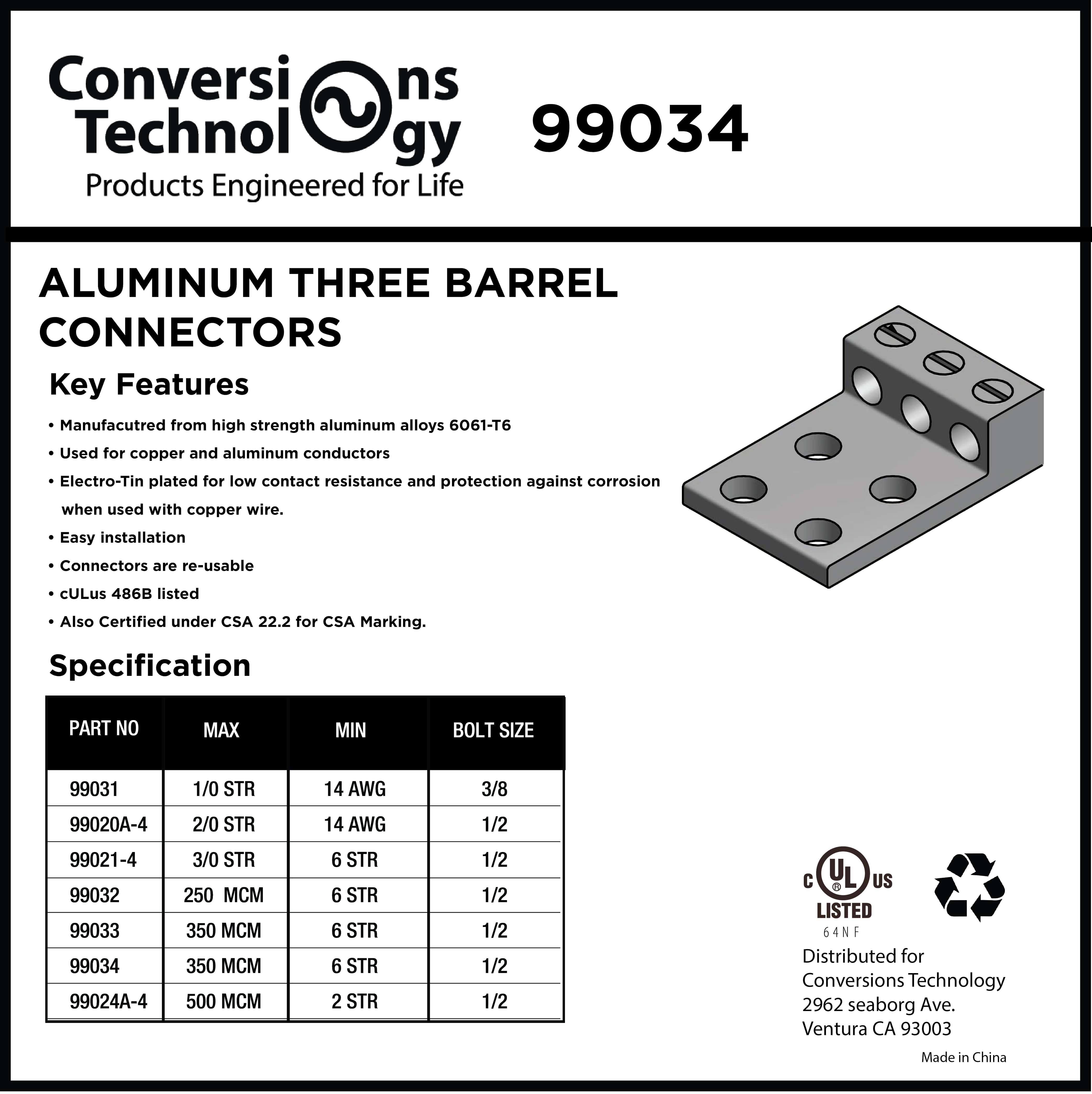 The 99034 350Kcmil Connector is a high-quality electrical component designed for secure and efficient termination of large conductors up to 350 Kcmil. With its robust construction and reliable design, this connector ensures a durable and dependable connection in industrial and commercial electrical applications.