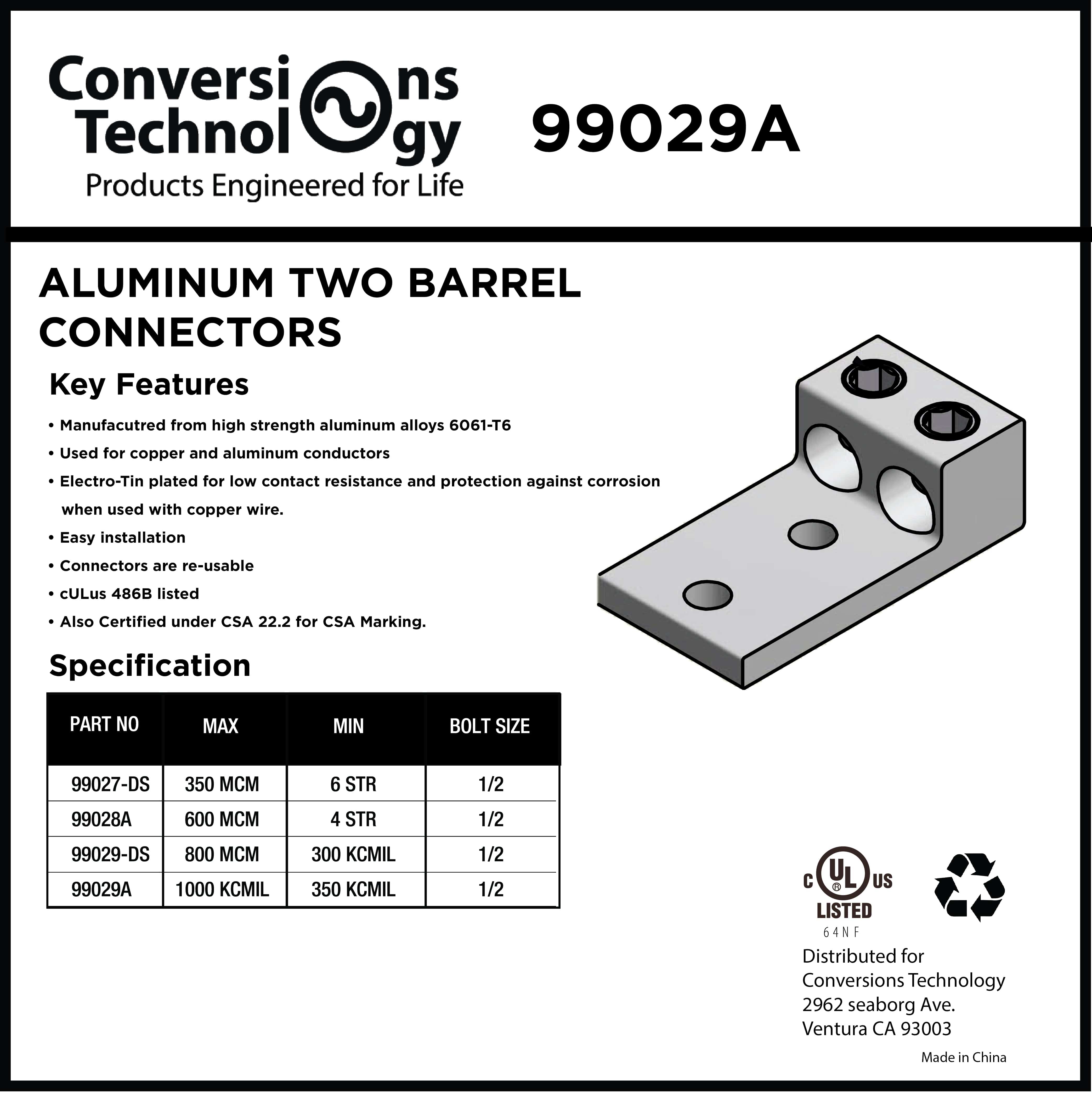 Aluminum Two Barrel Connectors 350 kcmil min. to 1000 kcmil max. 1/2 Inch Stud Size