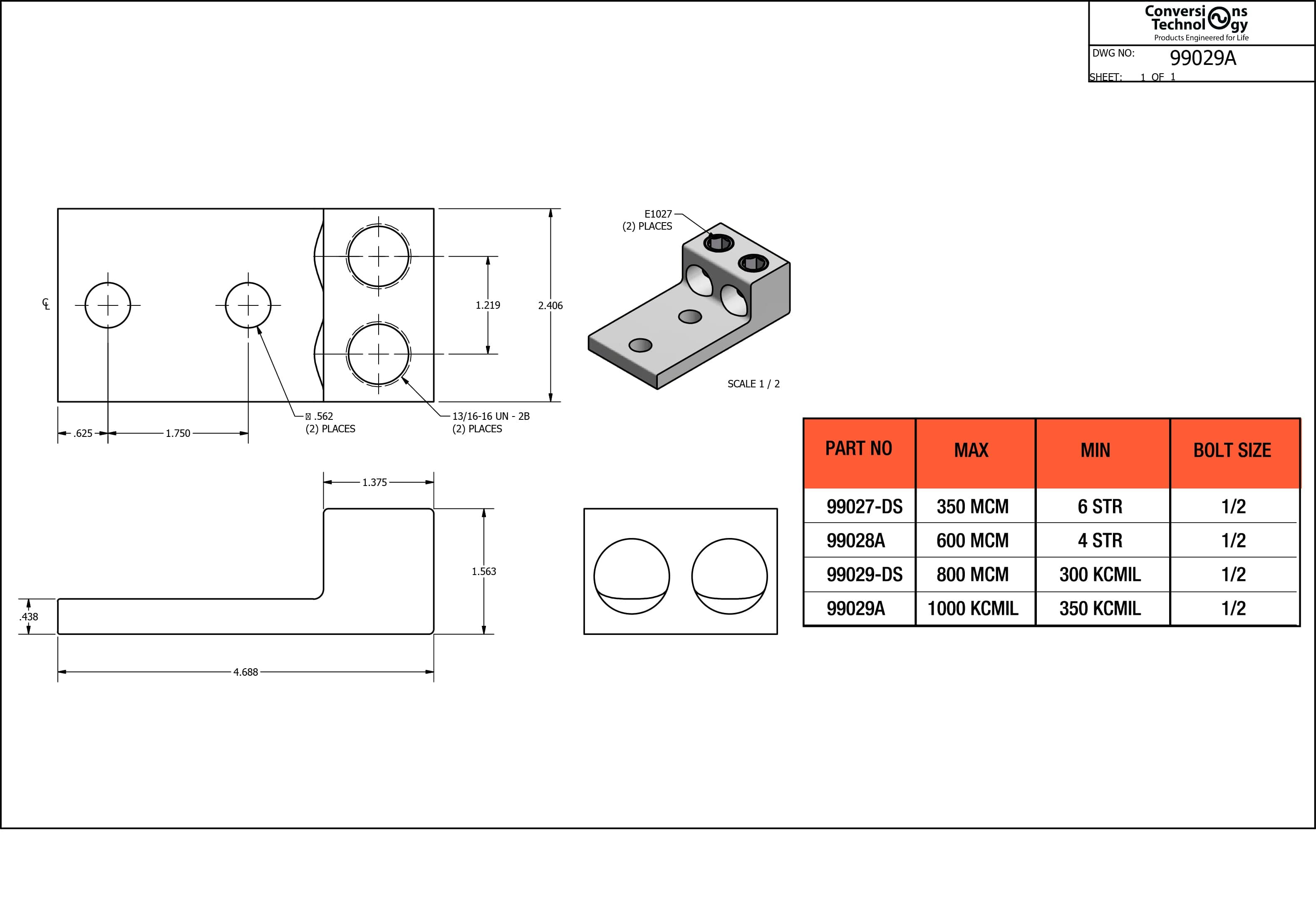The 99029A 1000Kcmil Connector is a high-capacity electrical termination solution designed to handle large conductors up to 1000 kcmil. Crafted with durability in mind, this connector features robust construction and an efficient design, providing a reliable and secure solution for high-current applications. With a versatile straight pad type and Allen screw type, it streamlines the installation process, making it suitable for diverse industrial and commercial settings. The 99029A ensures a stable and efficient electrical connection, meeting the demands of applications requiring substantial conductor sizes.