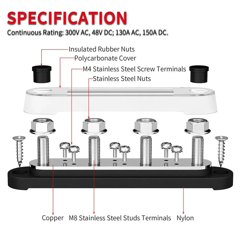 【Rating】- This marine power distribution block can handle voltage @ Max 300V AC, 48V DC, and continous amperage @ Max 130A AC, 150A DC.