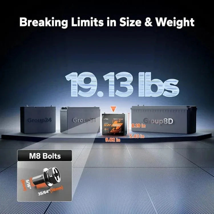 • Compact & Lightweight: World’s smallest 12V 100Ah LiFePO₄ battery (Group 22NF form factor, 19.13 lbs).