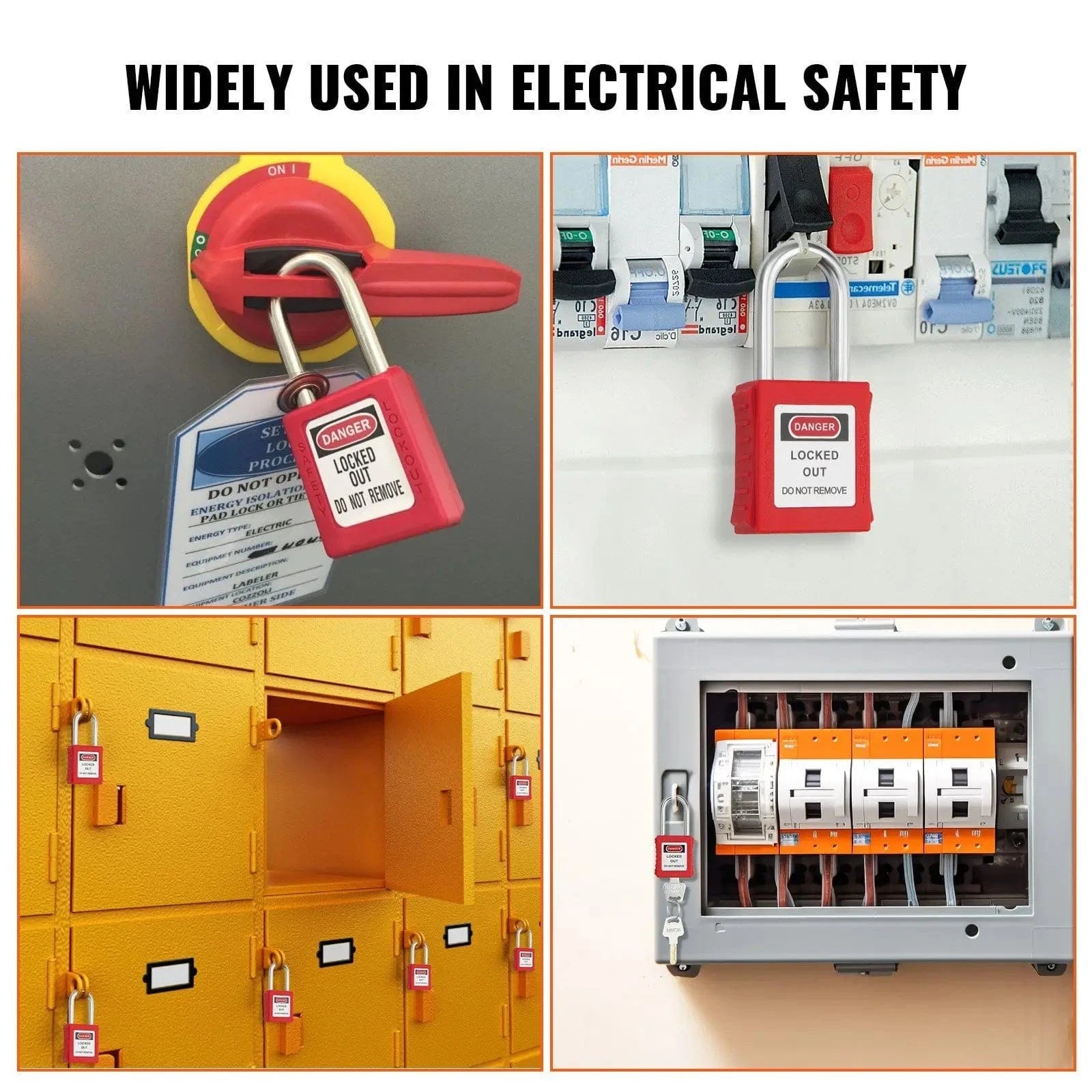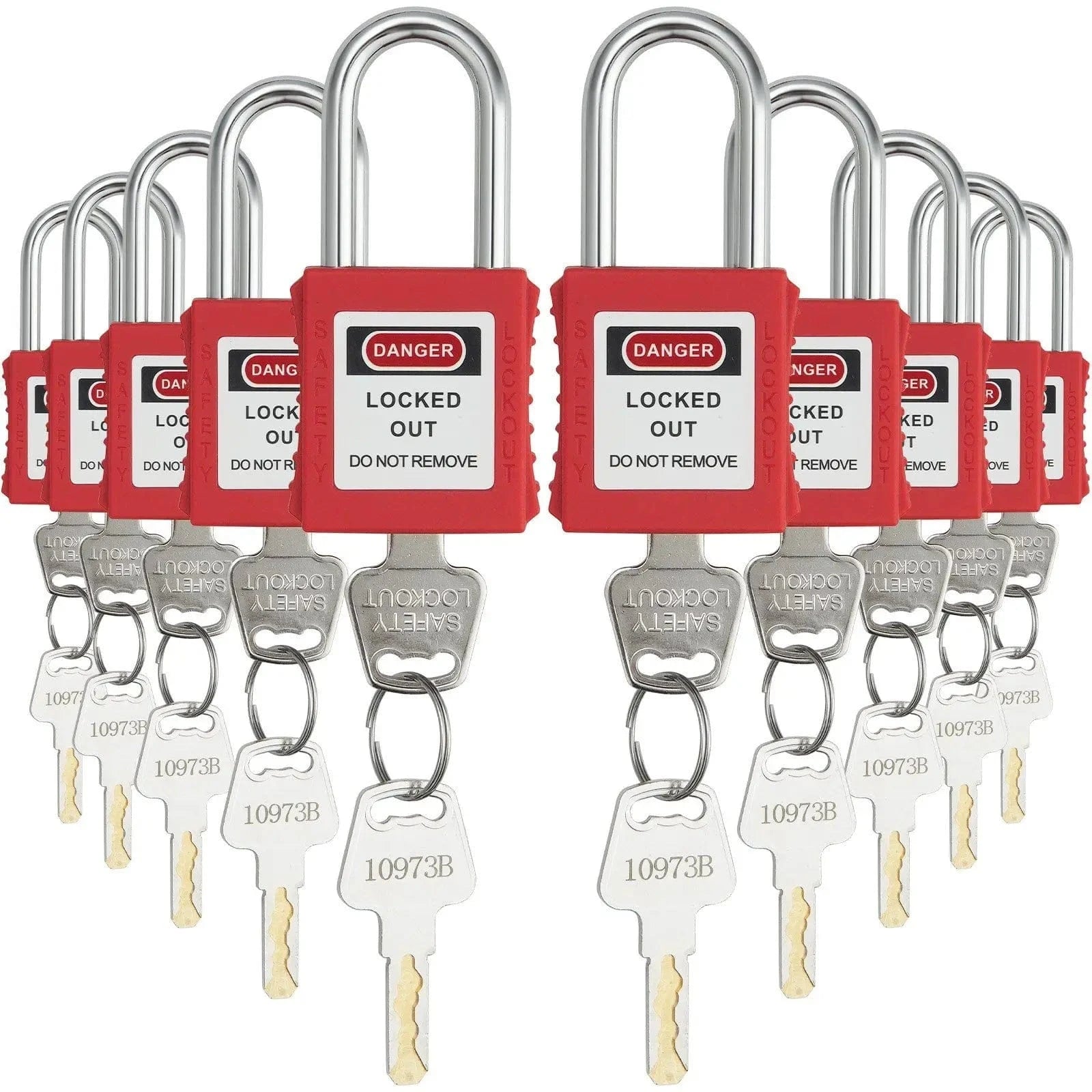 Ensure workplace safety and prevent accidents with the lockout tagout safety padlock set. Includes 10 red safety padlocks, each compliant with OSHA lockout/tagout standards for electrical and mechanical hazard prevention. Designed for professional lockout procedures on power switches, gas valves, pipeline valves, and mechanical moving parts.