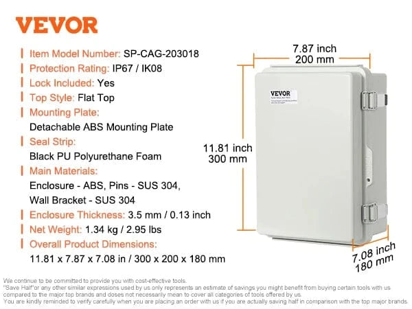 • 300 x 200 x 180 mm——This waterproof box has external dimensions of 11.81 x 7.87 x 7.08 in/300 x 200 x 180 mm and internal dimensions of 10.55 x 6.61 x 6.14 in/268 x 168 x 156 mm, providing ample space for convenient wiring of electrical components.