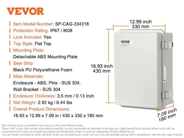 • 430 x 330 x 180 mm——This waterproof box has external dimensions of 16.93 x 12.99 x 7.09 in/430× 330 x 180 mm and internal dimensions of 15.12 x 11.18 x 6.29 in/384 x 284 x 160 mm, providing ample space for convenient wiring of electrical components.